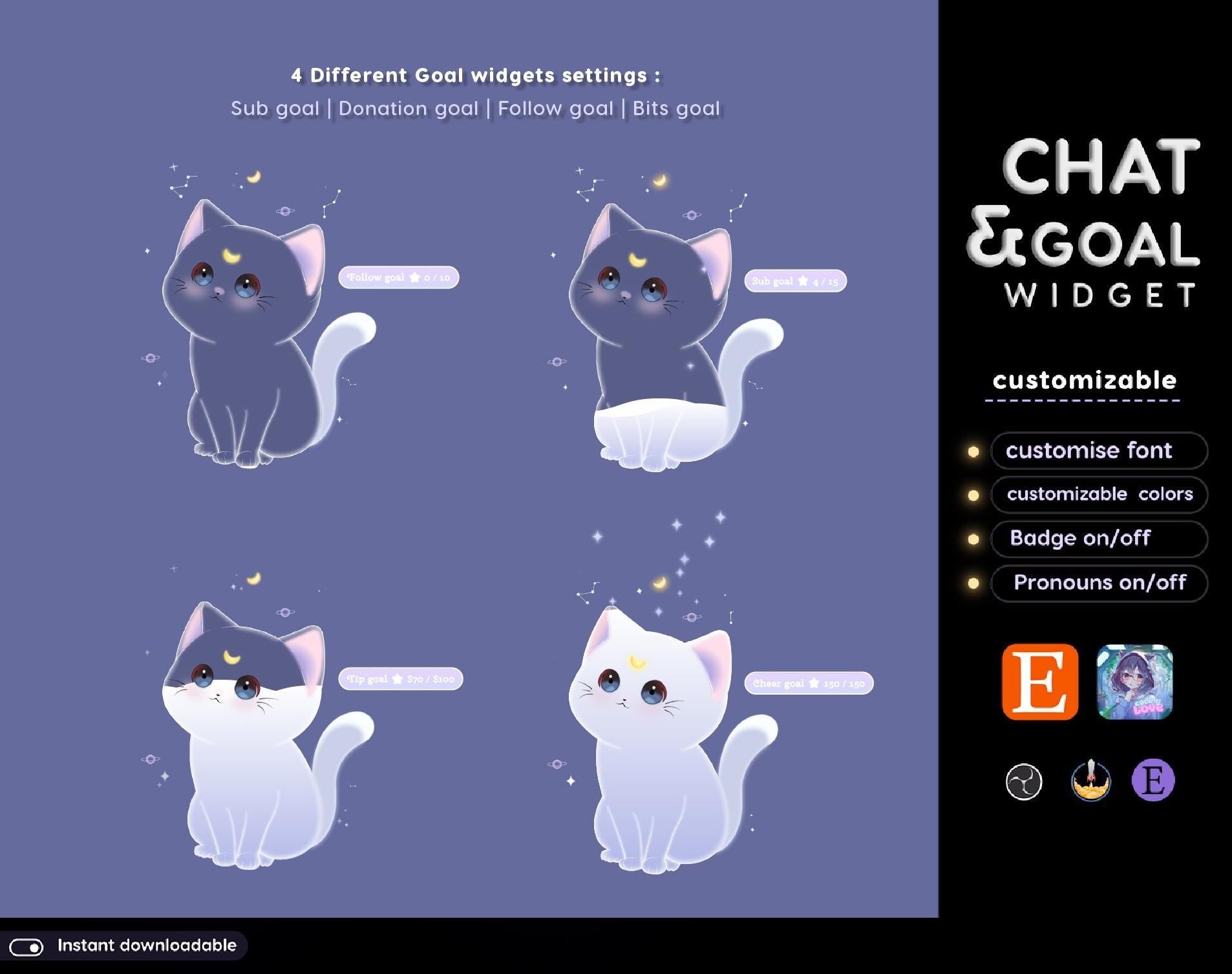 Lunar Cat Aesthetic Light Purple Chat & Goal Stream Widgets - Animated, celestial Elegant Lunar Theme Clean Vibe Streamelement Only