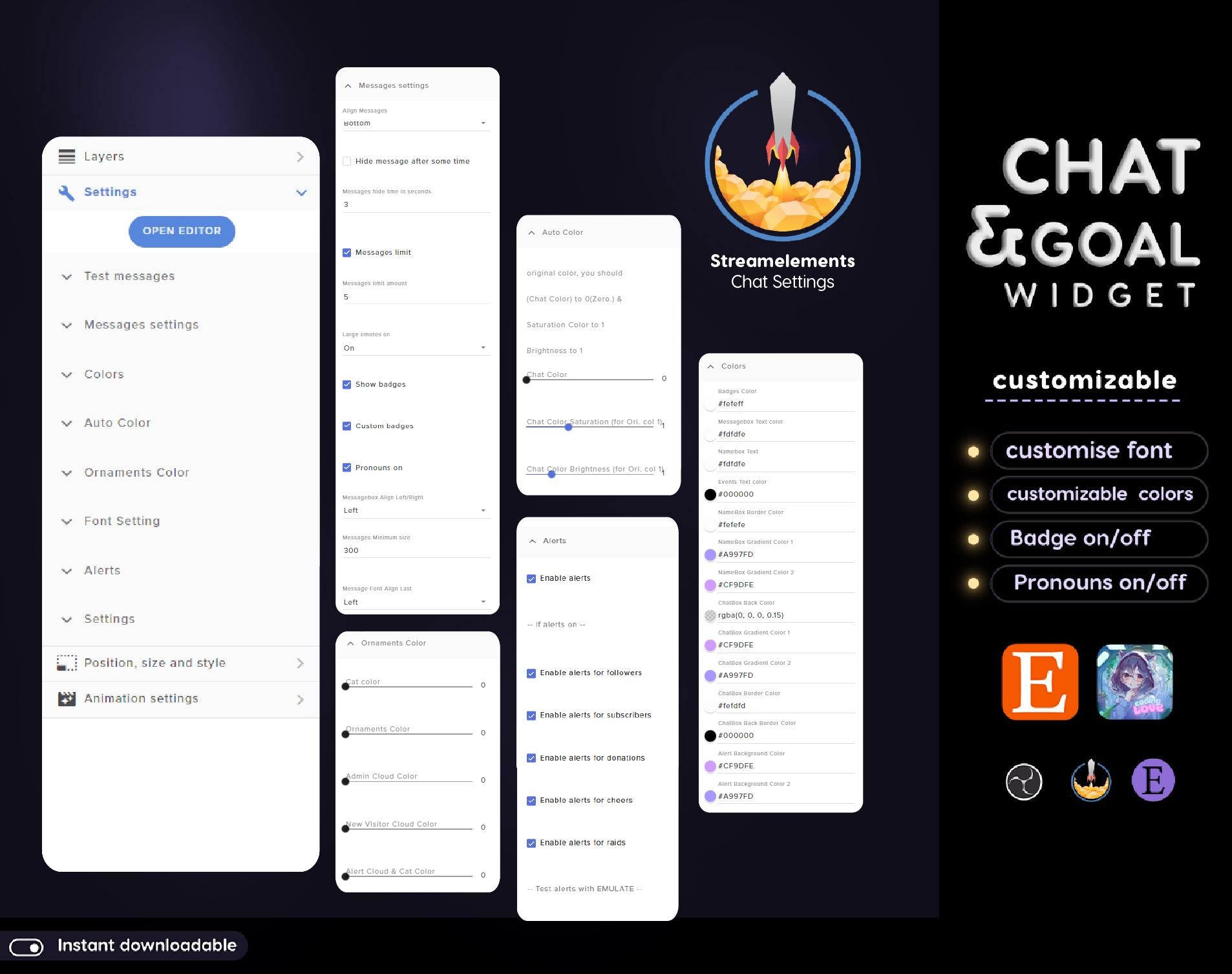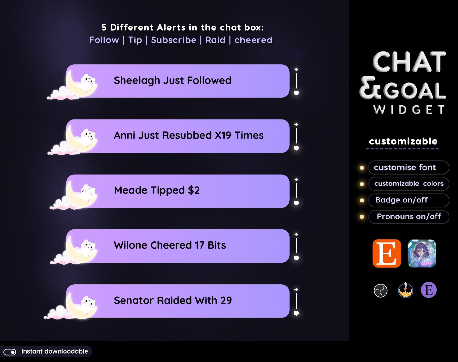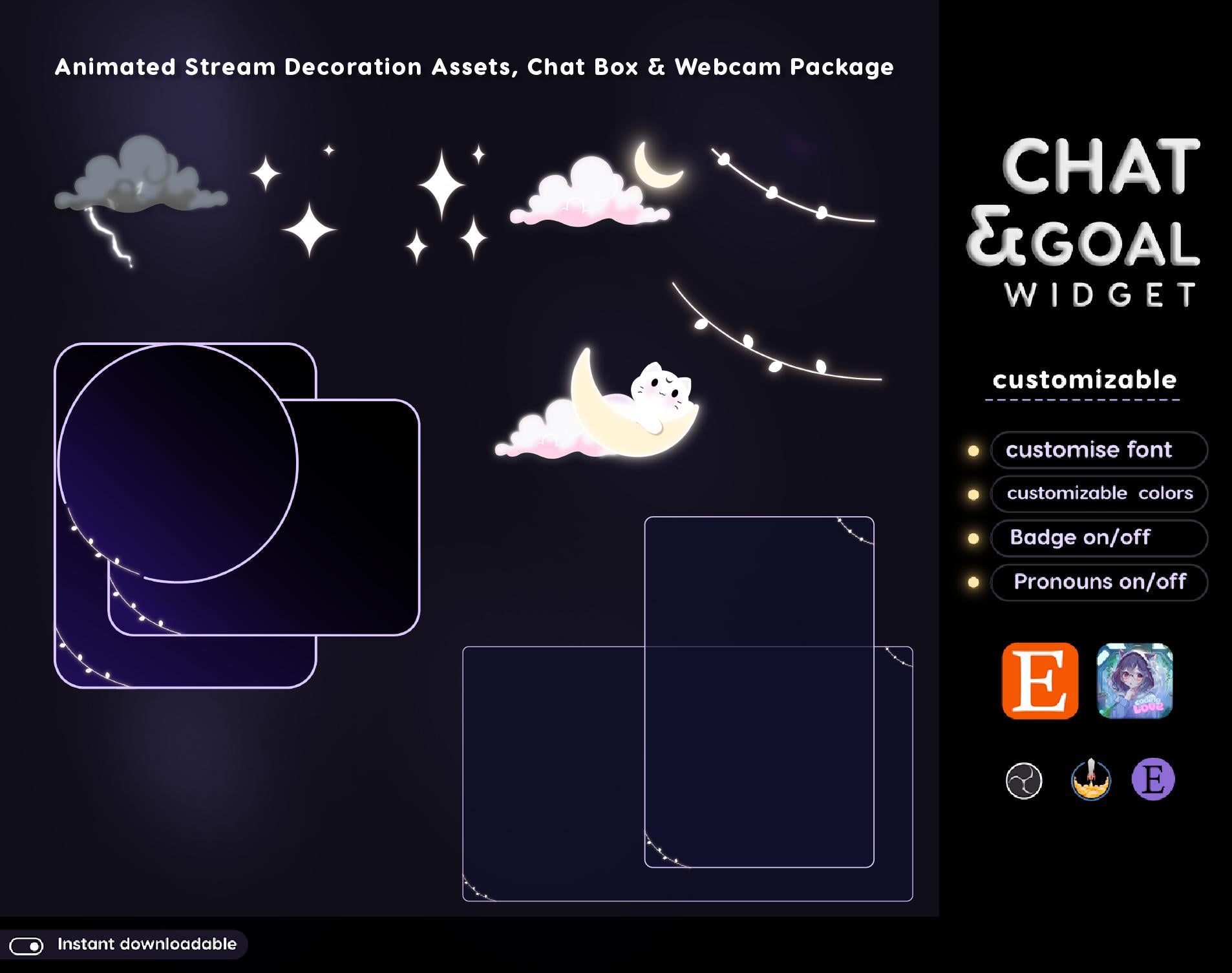 Lunar Cat Aesthetic Light Purple Chat & Goal Stream Widgets - Animated, celestial Elegant Lunar Theme Clean Vibe Streamelement Only 💜The chat widget includes role icons for Twitch using Streamelements and for using a CSS file. 💜There is a goal widget available for Twitch. 💜You can customize the accent color. 💜You have the option to show or hide pronouns. 💜Event alerts such as followers, subscribers, tips, and cheers are displayed in the chat. 💜You can choose to show or hide badges. 💜There is a message limit that you can set. 💜You have the ability to ignore specific users. 💜You can align the messages to be displayed at the top or bottom of the widget. FILE CONTENTS: - Streamelements chat widget - Streamelements Goal widget - Instruction (in download file) - Vtuber accessories ornaments Bonus Elements * StreamElements AND OBS Studio tutorials included ✨Easy to Use, Even Easier to Love * Files download instantly after purchase * Commission me for custom work if you need something extra special 💌 **Questions?** Just ask! I'm happy to help you make your stream look amazing