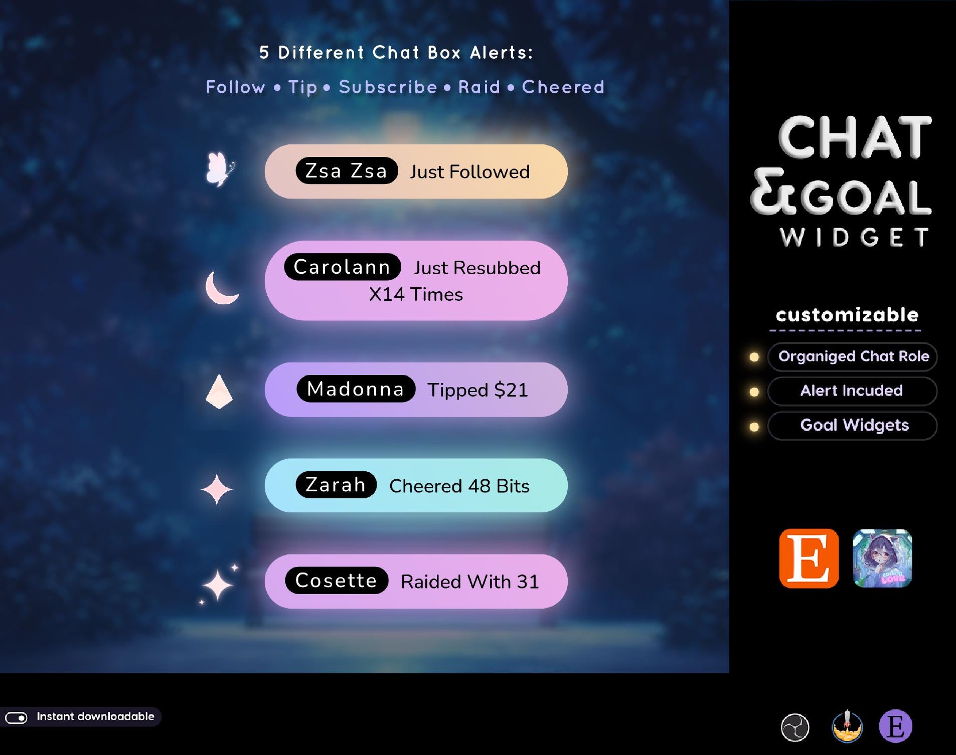 💜Event alerts such as followers, subscribers, tips, and cheers are displayed in the chat.