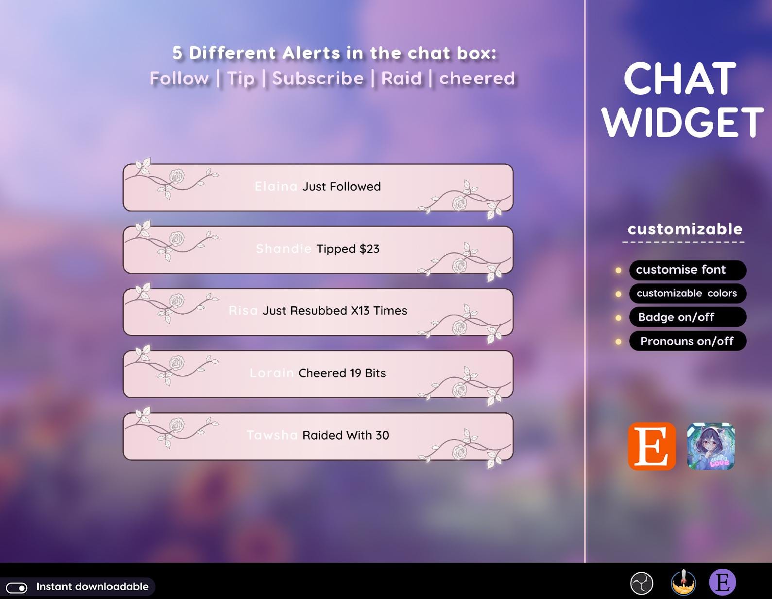 💜Event alerts such as followers, subscribers, tips, and cheers are displayed in the chat.