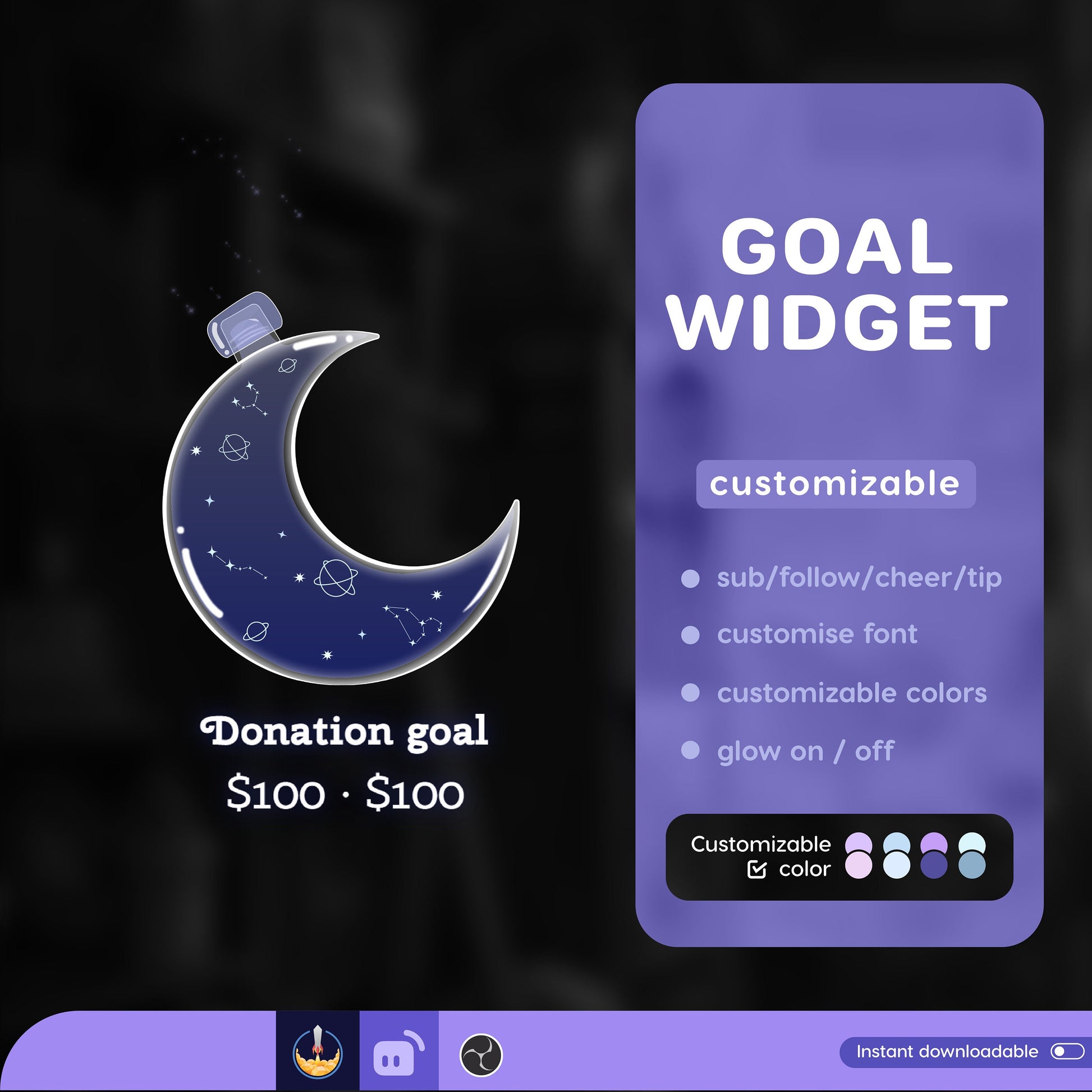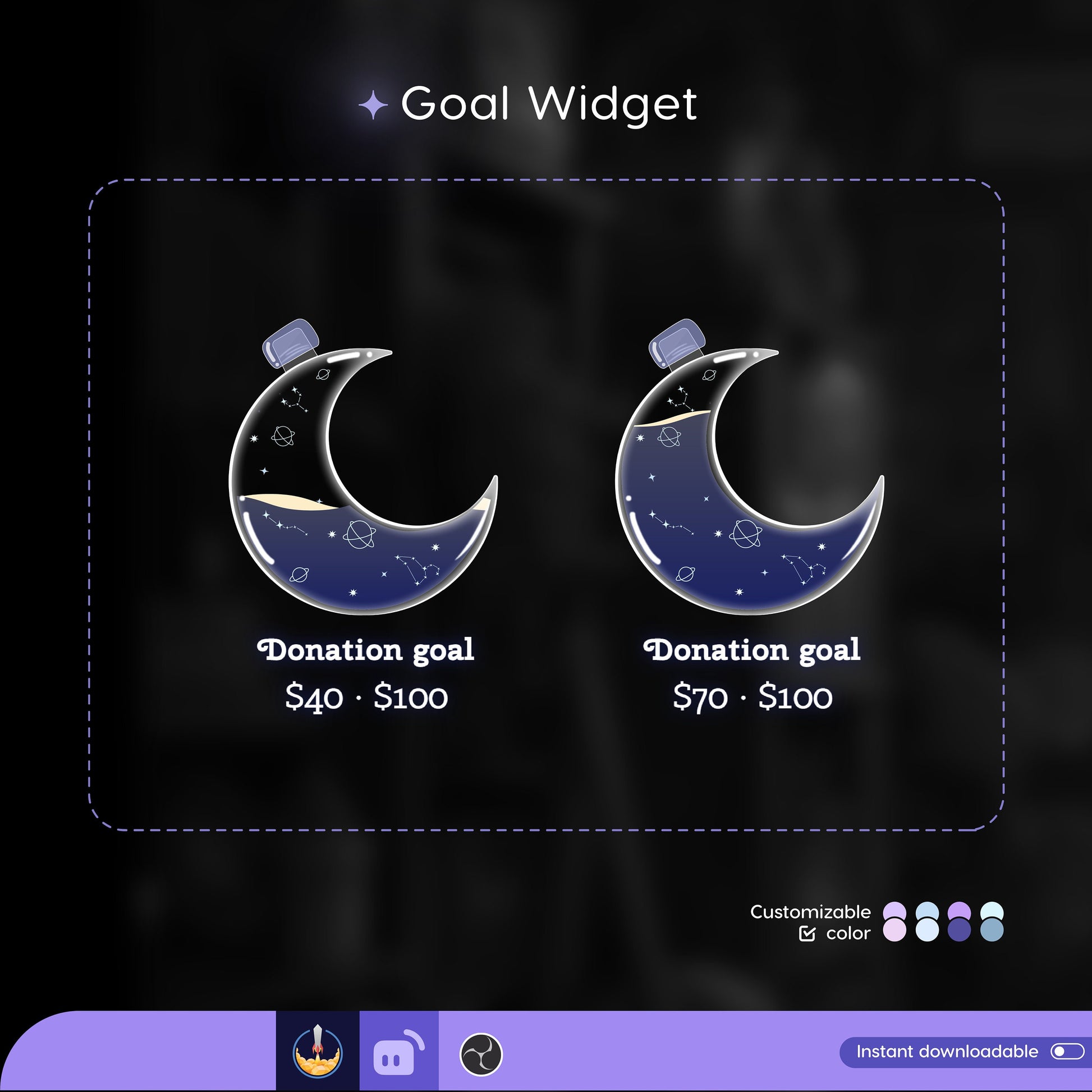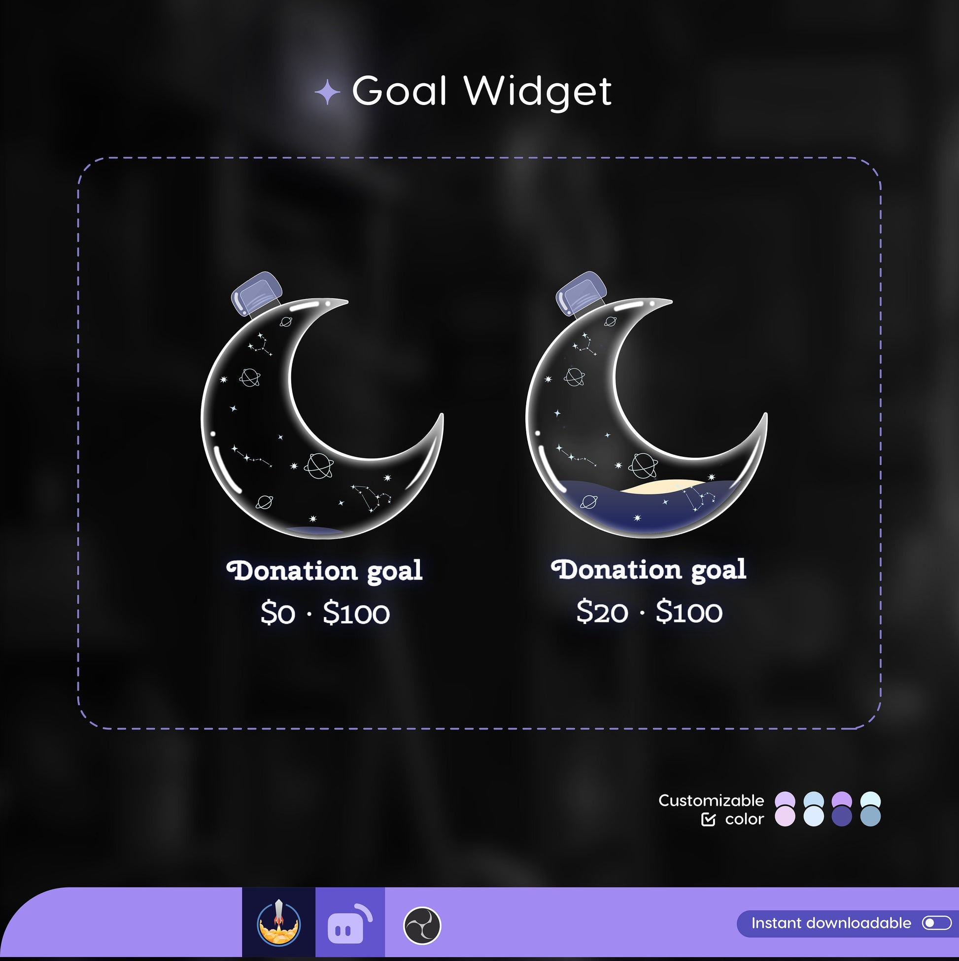 Astronomy Moon Liquid Filling Goal Widget is fully customisable for Twitch Streamlabs and Streamelements